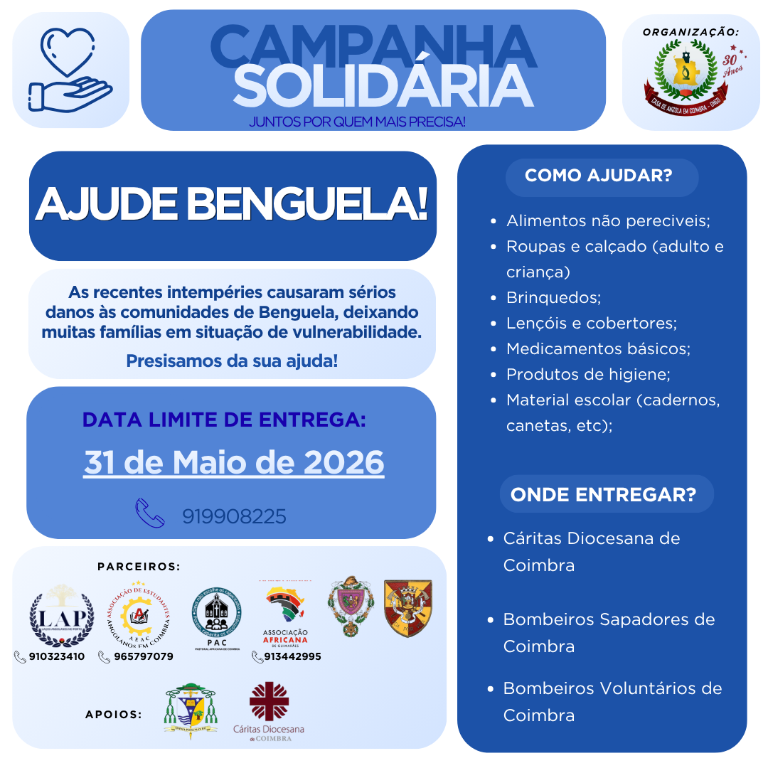 A Casa de Angola em Coimbra-ONGD, lança oficialmente a campanha de solidariedade intitulada ““Campanha de Solidariedade para as Populações de Benguela – Angola”, com o objetivo de apoiar comunidades em situação de vulnerabilidade na província de Benguela.