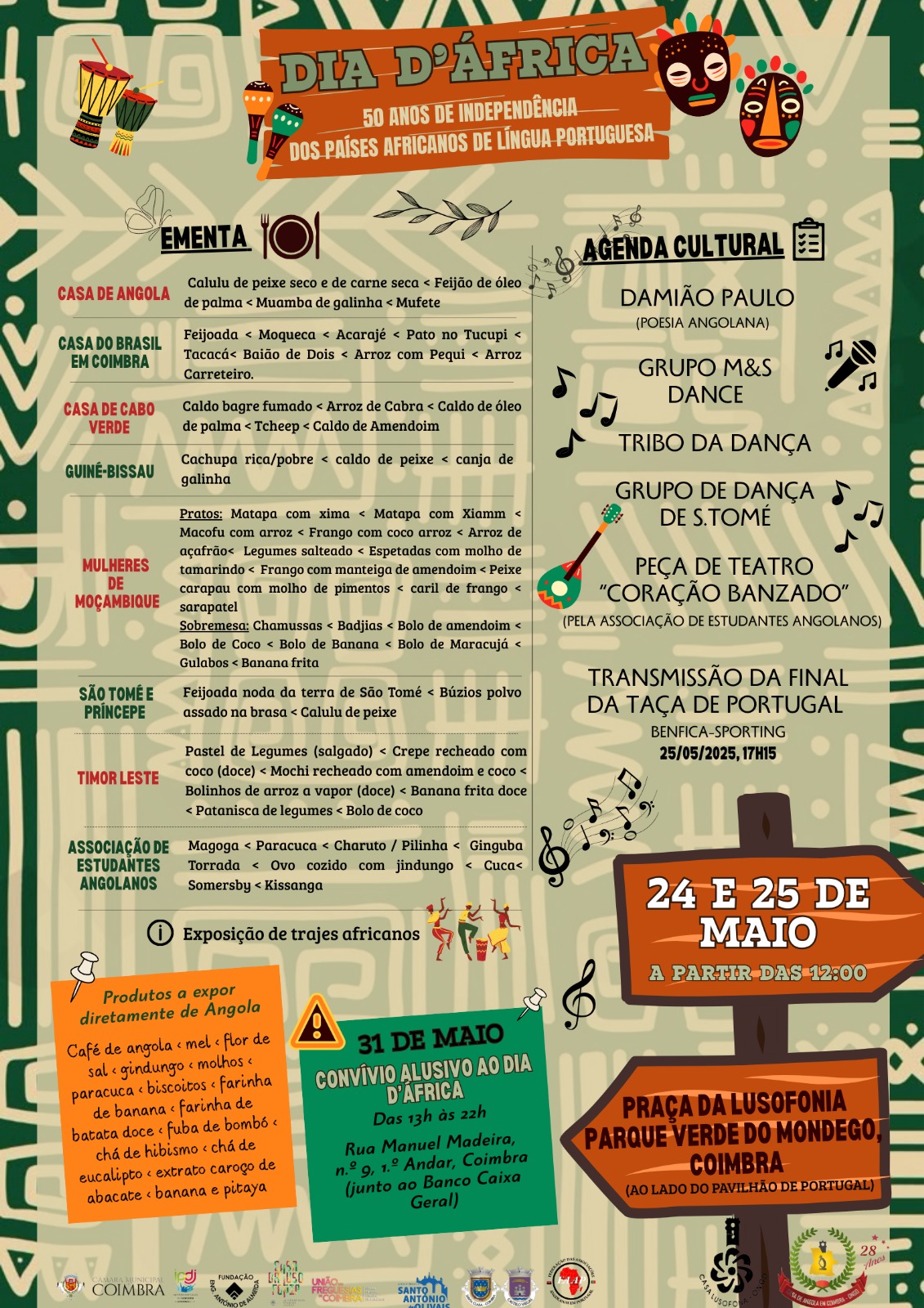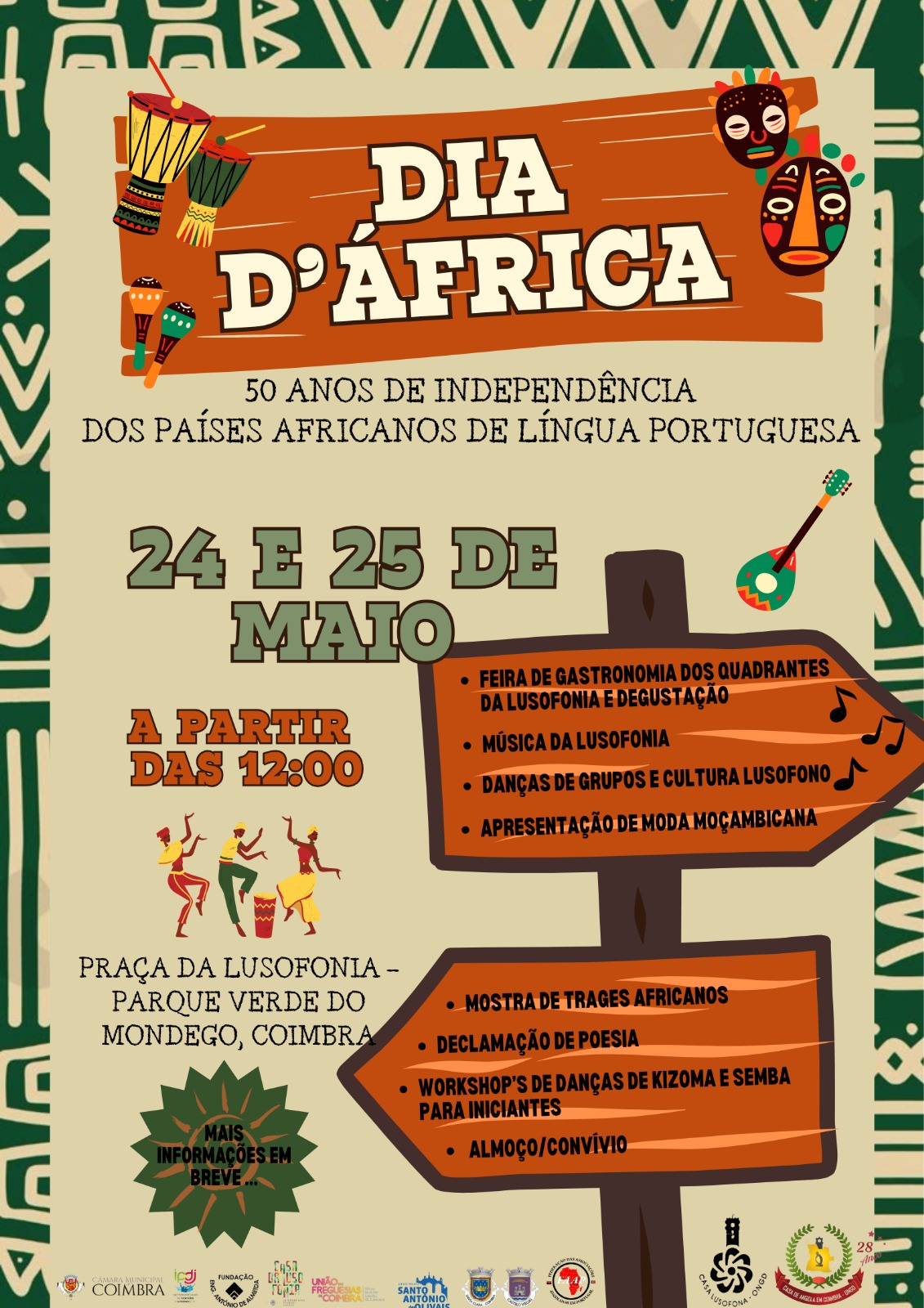 A Casa de Angola em Coimbra (ONGD), em colaboração com as associações representativas das comunidades imigrantes africanas lusófonas e não lusófonas da cidade, convida à participação nas Celebrações do Dia de África, e dos 50 anos de independência dos países Africanos da Língua Oficial Portuguesa, que terão lugar nos dias 24 e 25 de Maio, no Parque Verde do Mondego, Praça da Lusofonia em Coimbra.