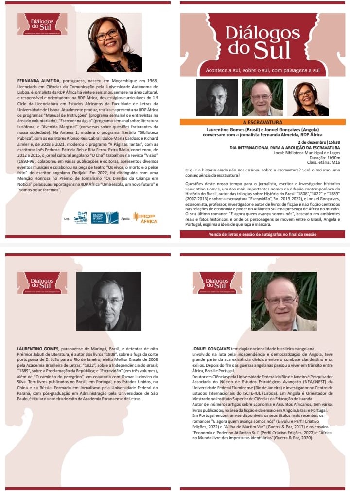 Os escritores e investigadores Laurentino Gomes (Brasil) e Jonuel Gonçalves (Angola) conversam com a jornalista Fernanda Almeida (RDP África) no Dia Internacional para a Abolição da Escravatura