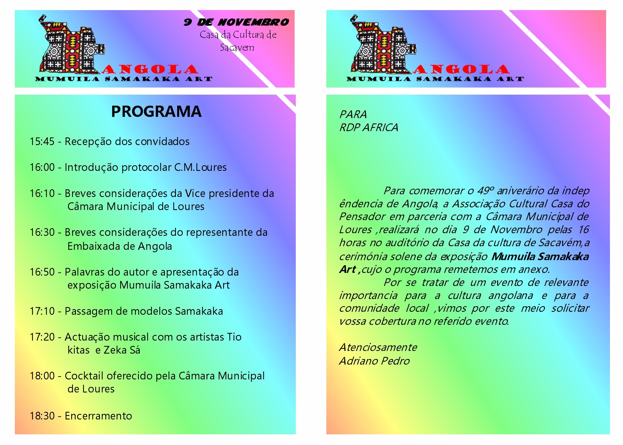 Para comemorar o 49º aniversário da independência de Angola, a Associação Cultural Casa do Pensador, em parceria com a Câmara Municipal de Loures, vai realizar, no dia 9 de novembro, pelas 16 horas, no auditório da Casa da Cultura de Sacavém, a cerimónia solene da exposição Mumuila Samakaka Art, um evento de relevante importância para a cultura angolana e para a comunidade local.