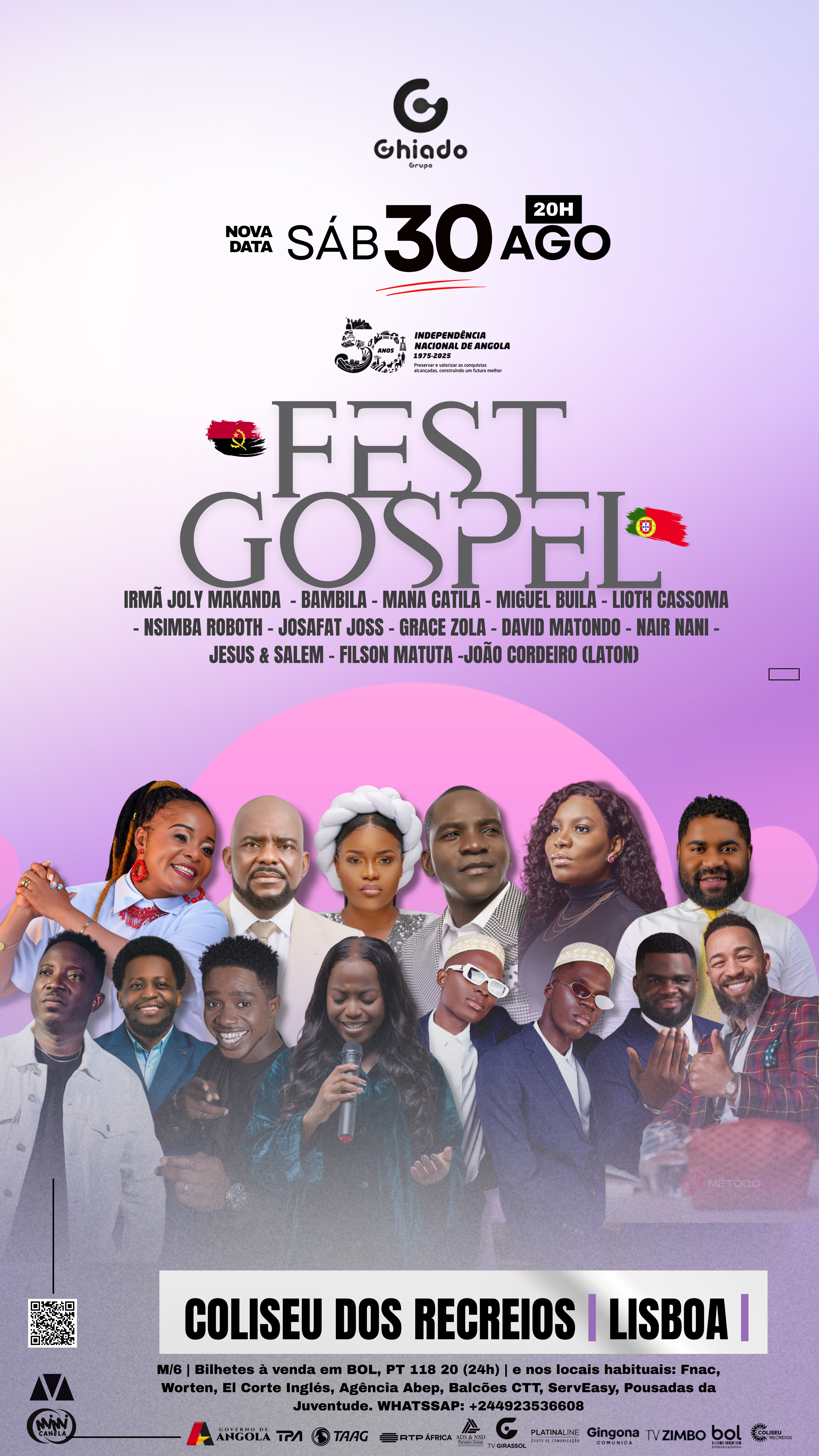 🎤 Com um line-up poderoso: Irmã Joly Makanda, Bambila, Mana Catila, Miguel Buila, Lioth Cassoma, Nsimba Roboth, Josafat Joss, Grace Zola, David Matondo, Nair Nani, Jesus & Salem, Filson Matuta, João Cordeiro (Laton) e muitos mais! 🔥