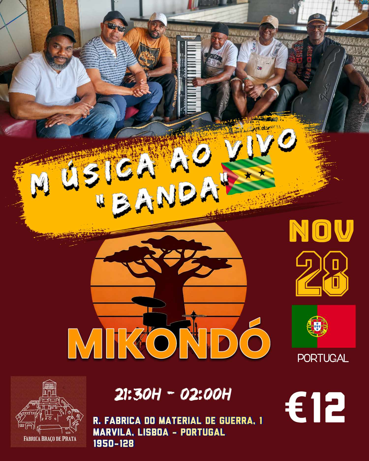 22h30 – Fábrica Braço de Prata – MIKONDÓ Revitalizando a Música Santomense, MIKONDÓ é uma banda de seis músicos de São Tomé e Príncipe, buscando reviver e modernizar géneros musicais santomenses, misturando a essência tradicional com sons contemporâneos para uma experiência nova e cativante.