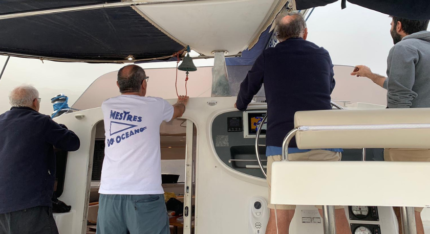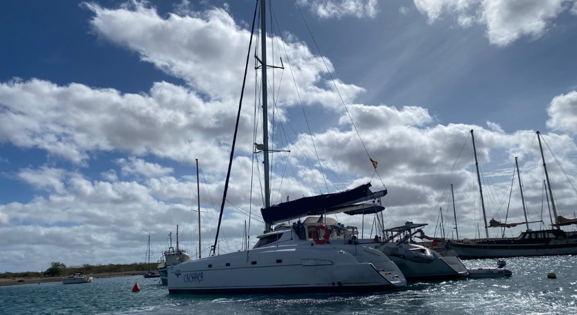 Depois das peripécias que marcaram a partida do Sal, esta expedição lá arrancou, com um dia de atraso em relação ao previsto. O monocasco “Prosecco”, da charter espanhola Alboran, não estava em condições de navegar com o mínimo de segurança, pelo que foi substituído por um catamaran. Tudo somado, ficámos a ganhar com a troca. A começar pelo próprio nome: “Prosecco” não é nome que se dê a uma embarcação de recreio, cuja tripulação encara o andar à vela como um prazer e uma forma de celebrar a alegria de viver, a boa disposição e a amizade. Já o catamaran foi batizado com um nome muito mais apropriado ao espírito e à letra desta singularíssima regata. Calcule o leitor que o novo veleiro chama-se “Cachaça”! Ou mais corretamente “Cachaca”, mas aqui para nós alguém se enganou ao escrevê-lo, ou porque não sabia grafá-lo corretamente, ou porque no estaleiro onde o catamaran foi construído não havia uma cedilha, o adereço que faz com que o vocábulo cachaca seja promovido a cachaça. O que é certo é que quando a tripulação tomou posse do catamaran houve quem entoasse, baixinho, a conhecida estrofe “há quem diga que cachaça é água, cachaça não é água não…”