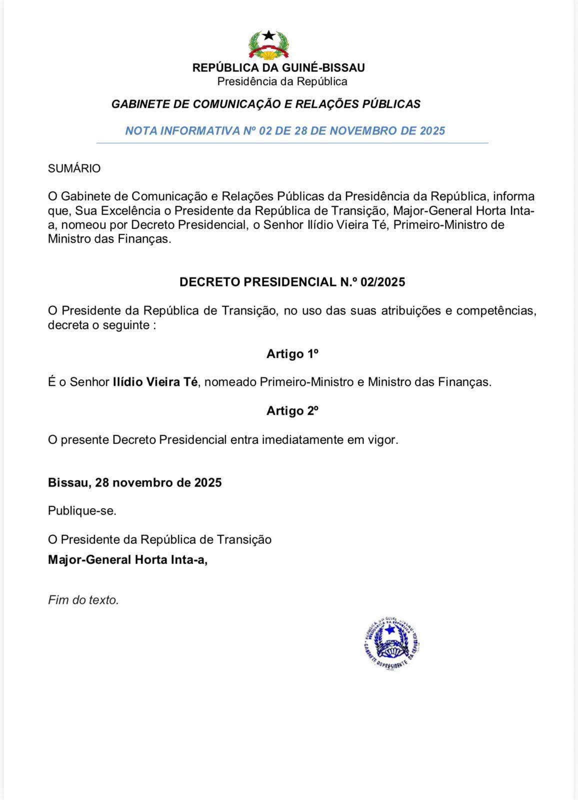 Na Guiné-Bissau, o Presidente da República de transição nomeou um novo Primeiro-Ministro e Ministro das Finanças. Trata-se de Ilído Vieira Té, figura muito próxima de Sissoco Embaló, e que foi mandatário da plataforma republicana Nô Kumpu Guiné nas ultimas eleições gerais. O decreto não está assinado.